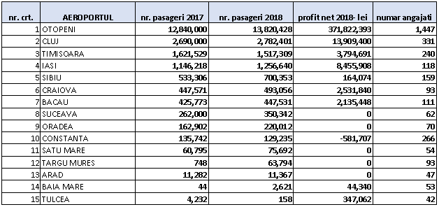 Se remarcă, în registru negativ, aeroportul din Constanța, care deși are o pierdere de 581.707 lei în 2018, plătește salarii pentru 266 de angajați, în condițiile în care, până în 2020, a primit și un ajutor de stat în valoare de 58.549.000 lei, în conformitate cu Ordinul nr. 1110 din 19.06.2018 al Ministerului Transporturilor.