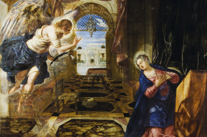 Jacopo Robusti Tintoretto plasează Buna Vestire (1518-1594), în interiorul unui palat veneţian din vremea sa. Fecioara Maria este surprinsă de Arhanghelul Gabriel în timp ce se roagă. Trupurile alungite ale celor două personaje se răsucesc elegant în jurul propriei axe, imprimând o mişcare spiralată întregii compoziţii. Desenul riguros geometric al dalelor de marmură ne conduce privirea spre curtea interioară şi dincolo de ea, spre portalul clasic şi peisajul din fundal. Draperii grele de catifea, cu falduri umflate de vânt, formează o graniţă flexibilă între interior şi exterior, între spaţiul sacru al scenei din prim plan şi cel profan al lumii din fundal.