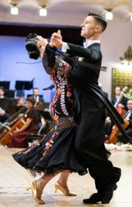Valsul vienez. Valsul vienez este unul dintre cele mai elegante si apreciate stiluri de dans, un stil de dans iconic pentru competitiile de performanta, acesta este usor de recunoscut atat tehnic, cat si prin codul vestimentar impus dansatorilor, tuxedo si rochie de bal. Valsul vienez se danseaza si in afara competitiilor profesionale, fiind adesea preferat pentru primul dans al mirilor. Originea numelui de vals, respectiv waltz in germana, este inca neclara, acesta referindu-se la mai multe dintre stilurile timpurii de ballroom dance. S-a ajuns insa la consensul ca Valsul Vienez ar fi valsul original si primul dansat in aceasta pozitie care a starnit controverse in perioada sa timpurie datorita apropierii dintre parteneri. In prezent, Valsul Vienez este un stil de dans distinct fata de valsul lent, englezesc, care se danseaza la dublul tempoului. Denumirea simpla de vals, face in general trimitere catre Valsul Vienez, recunoscut drept stilul original de vals si nu catre valsul lent, aparut mai tarziu. Valsul Vienez este legat de Viena prin muzica familiei Strauss. Valsurile vieneze au fost insa consacrate si de alti compozitori de muzica clasica ale caror opere au ajuns adevarate capodopere: „Lacul lebedelor”, „Frumoasa din padurea adormita”, „Spargatorul de nuci”, care au ajuns sa fie cunoscute si apreciate de o lume intreaga. Masura muzicala este de 3/4, tempoul fiind de 58-60 masuri pe minut.