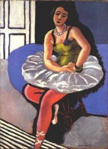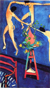 Dansul (1910) . Ulei pe pânză, 260 × 391 cm, Muzeul Ermitaj, Sankt Petersburg. Legată de fauvism , această pictură de mari dimensiuni i-a șocat pe iubitorii de artă ai vremii. Artistul caută să evoce dansul primitiv prin mișcarea corpurilor, nuditatea lor și contrastul violent al culorilor pure (doar trei culori). Primitivismul , un alt curent al vremii , a atras artiști inovatori. Dorința de ruptură cu arta academică, pe care încerca să o reprezinte, este totală aici. Matisse oferă viziunea sa grafică asupra dansului, energică și senzuală.