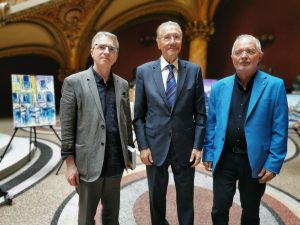 Autorul, alături de președintele Emil Constantinescu și de directorul artistic al Filarmonicii ”George Enescu”, Doru Marin